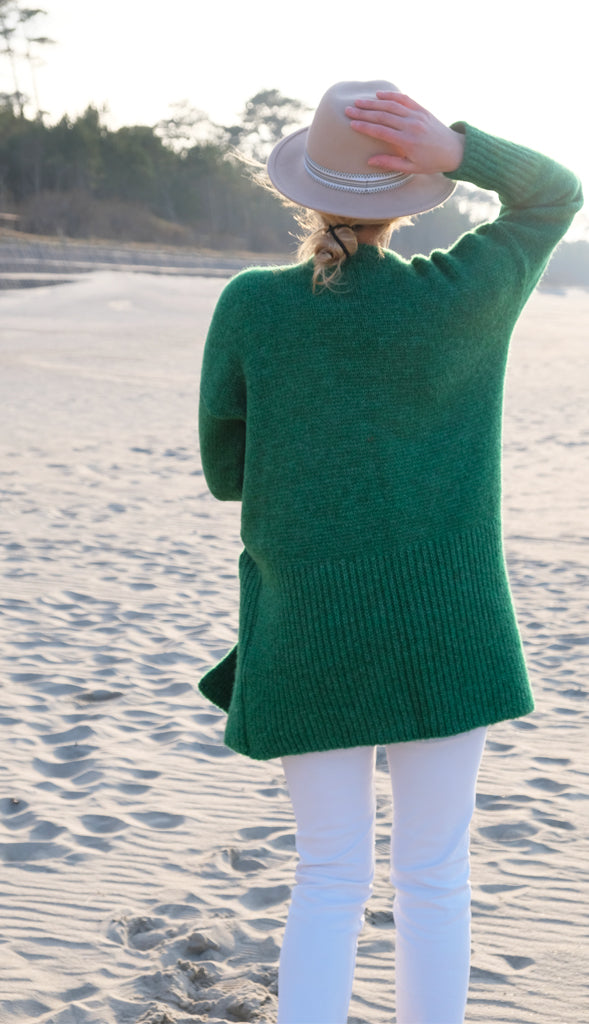 Delikatny i niegryzący sweter wykończony na dole ściągaczem. Po bokach posiada kieszenie. Sweter sprawdził się ze spodniami i dżinsami. Luźny i stylowy dopełni każdą stylizację.