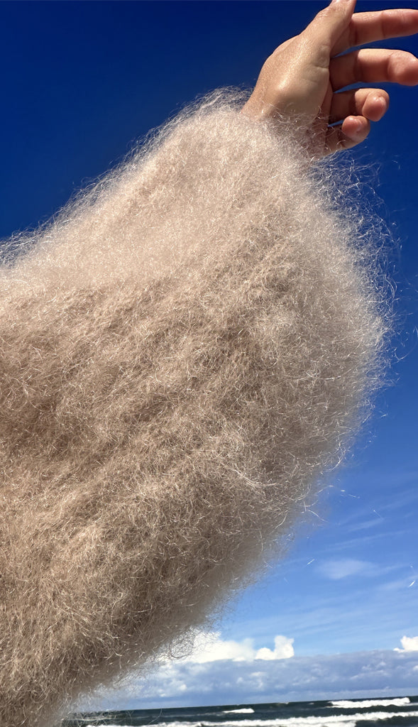 Puszysty moherowy sweterek. Nie gryzie i jest miły dla ciała. Rozmiar idelany dla kobiet noszących S i M. Sweterek wykończony modnymi, dzwonkowymi rękawami. Zachwycający a zarazem prosty krój sprawi,że będziesz się w nim czuła ultra kobieco.